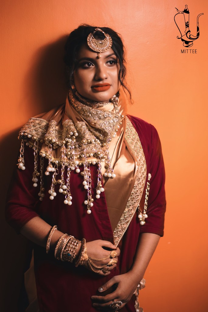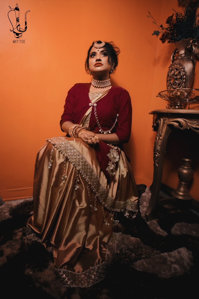A black and coral tinted saree with a dash of gold. Wear with love; wear with honour.