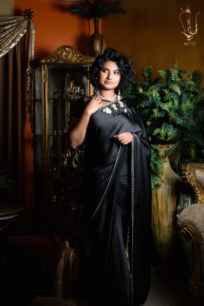 A smooth, silk licorice black saree sprinkled with silver roses. Perfect for a quiet candle-light dinner.