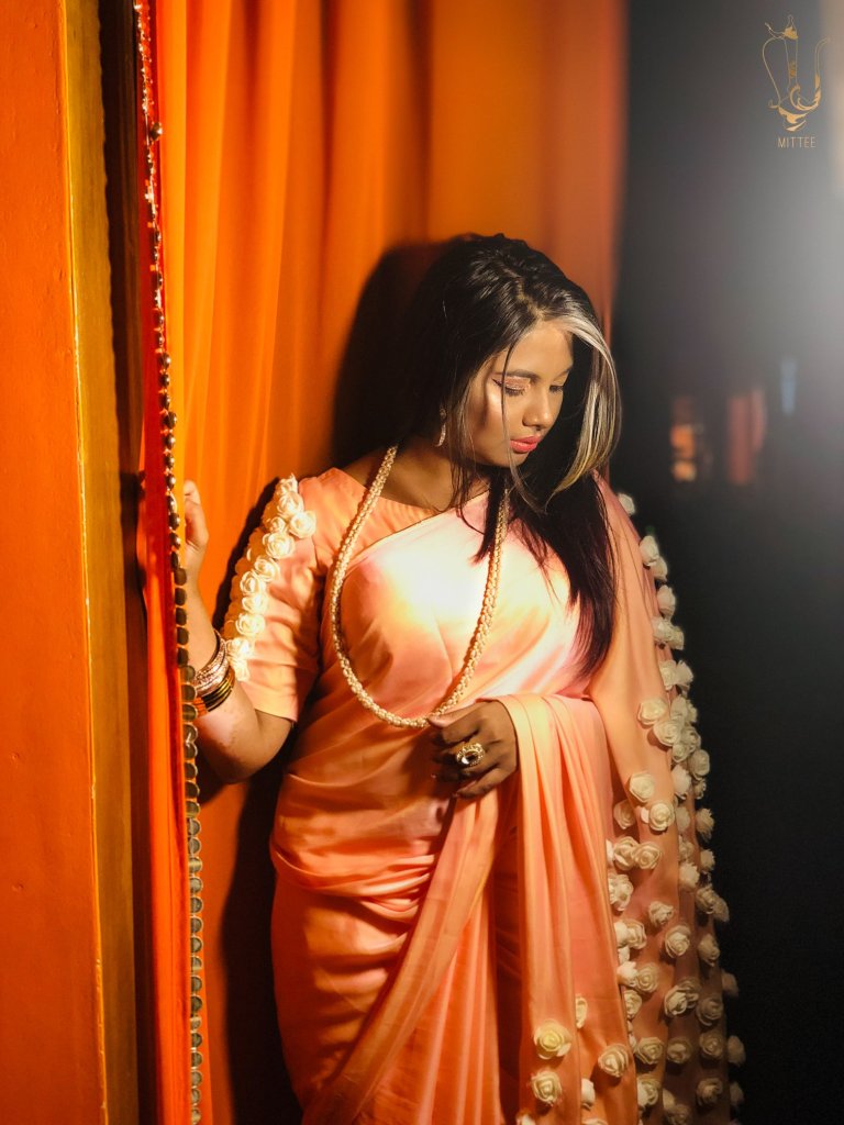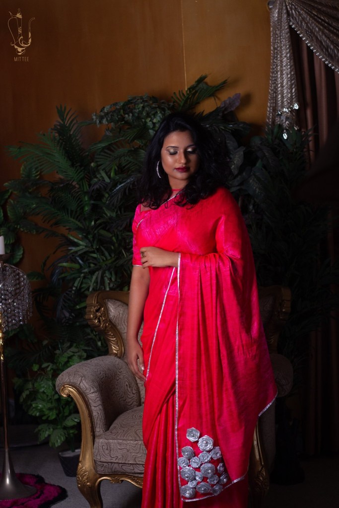A high-toned, neon-tangerine-pink saree powdered with a pinch of silver rose. Simple yet lush.